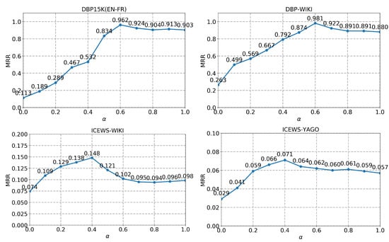 - When evaluating the ICEWS-WIKI and ICEWS-YAGO datasets, we observe a consistent trend in the performance of the model. The MRR peaks at a value of 0.4 for these datasets, while the best overall performance for the DBP15K(EN-FR) and DBP-WIKI datasets is achieved at a value of 0.6. This observation suggests that the ICEWS-WIKI and ICEWS-YAGO datasets have a higher dependence on the structural information of the model. This higher dependence on structural information can be attributed to the higher density and number of triples present in these datasets. Consequently, comparing structures in these datasets provides more valuable information.