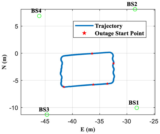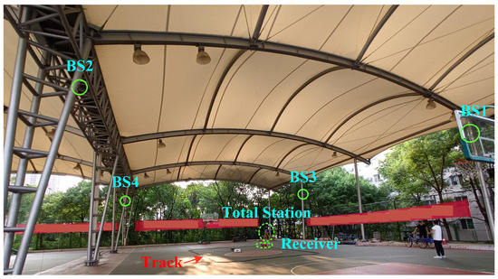 To verify the effectiveness of the MLMRC method, a set of GH-LPS was installed on a semi-enclosed basketball court. As shown in Figure 3, a total of four base stations (BS 1–BS 4) were used in the experiment, fixed on the support of the basketball court ceiling. The user receiver was mounted on a moving platform traveling in circles along the fixed track, which consisted of two straight segments and two curved segments, simulating a vehicle, as shown in Figure 4. Its maximum speed was maintained at around 1 m/s. The coordinates of the transmitting antennas of each base station are listed in Table 4, measured by a total station set next to the court. The coordinates are in the East-North-Up (ENU) frame which is a local frame centered in the total station [31]. The average horizontal dilution of precision value throughout the environment is approximately 1.16. It is worth noting that the carrier phase measurements, Doppler measurements, and IMU measurements used in this experiment were all from the raw data output by the user receiver. The MEMS-IMU LINS16460 was installed inside the receiver, with built-in accelerometers and gyroscopes of bias stability 10 and 4°/h, respectively, and the velocity random walk and angle random walk are 0.05 m/s/√h and 0.3 °/√h, respectively.