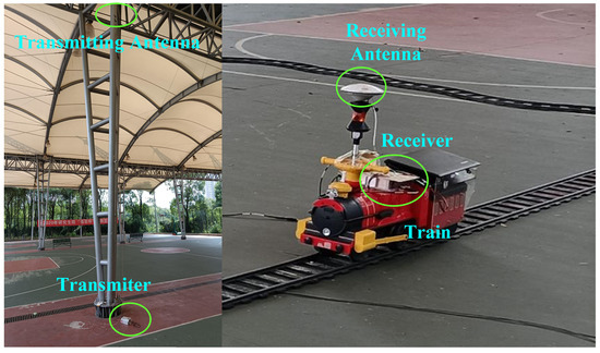 Details of base station 2 (left) and receiver (right). The base station transmits signals produced by the transmitter to the receiver through the transmitting antenna. The receiver mounted on the train receives the signals from base stations through the receiving antenna.