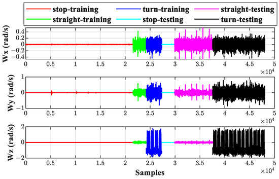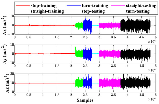 Two separate sets of experimental data are selected for training and testing, respectively. Each data set contains three sorts of motion: stationary, straight, and turning. The raw data from the accelerometer and gyroscope are shown in Figure 5 and Figure 6, respectively. It can be seen that there are differences in amplitude between the training and testing data under the same behavior, and even differences exist between the data under the same behavior in the training set. On the one hand, the tilt angle is different because the platform is in various positions, which causes changes in the projection components of gravity on each axis when the platform is stationary. On the other hand, factors such as vibration during the experiment may generate certain outliers, which may affect the purity of the data.