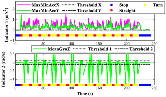 The traditional method refers to the following threshold-based method. Gao et al. use the standard deviation of accelerometer measurements within a fixed time window to determine whether the vehicle is stationary or not and use vertical axis gyroscope measurements to determine two types of vehicle movements: turning and straight [15]. Thus, criterion 1 and criterion 2 correspond to Formulas (7) and (9) in reference [15], respectively. The window length is set to 1.5 s according to the literature, and the recognition results are shown in Figure 7. When the platform is stationary, the statistics constructed by criterion 1 (MaxMinAccX and MaxMinAccY) are significantly smaller than those in the dynamic motion, which can effectively determine whether the platform is stationary or not. For criterion 2, when the platform moves in a straight line, the statistics (MeanGyoZ) are relatively flat and different from that in the turning motion. However, it is worth noting that the movement of the platform is continuous, as shown in criterion 2. Although it is possible to ensure that there are no omissions in recognition of straight motion by setting two thresholds, there will always be some non-straight motions that are misclassified as straight motions, which can lead to incorrect positioning constraints and pose risks. In addition, there are also certain times when the statistics are false due to outliers, vibrations, etc. Therefore, although different motion behaviors can be distinguished by constructing thresholds, it is not easy to set appropriate recognition thresholds in the face of actual data to ensure that all motion behaviors can be accurately classified.