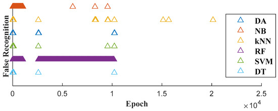 False recognition points of different machine learning methods. Except for various false points of NB and RF, most of the other false points of different methods show a similar pattern around certain epochs.