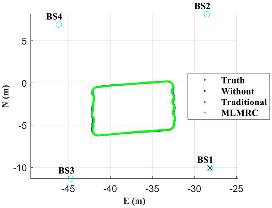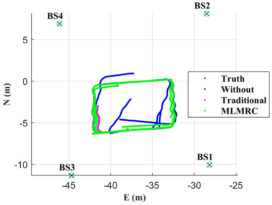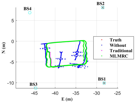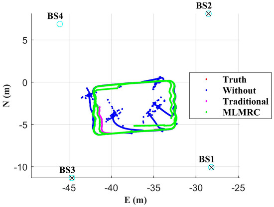 Positioning results in all four base stations’ blockage condition. × represents the base stations with blockage.
