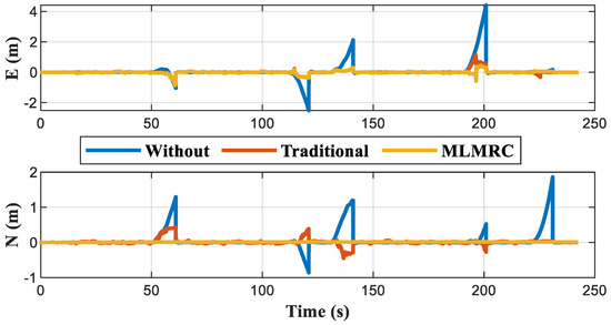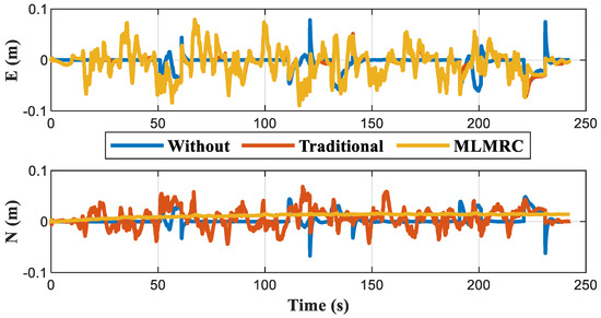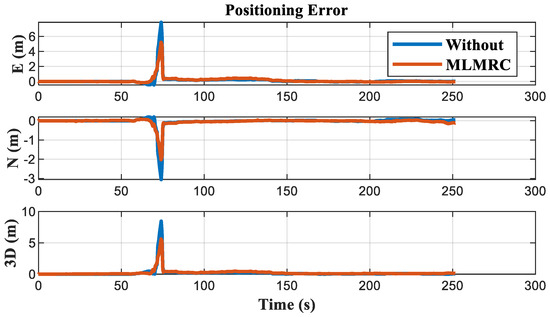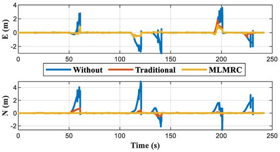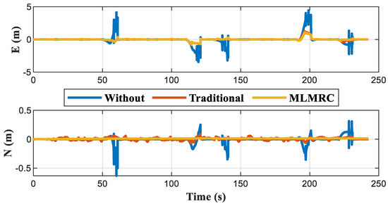 When all four base stations are blocked, there is no available information to correct the cumulative error of INS, and the positioning results are shown in Figure 18. Figure 19 further indicates that the positioning error within each blockage interval continues to increase over time. After adding the positioning constraint equations, the horizontal positioning error of the MLMRC method is only 82.8% (maximum) and 78.5% (RMS) of the traditional method. The RMS of the error in E and N directions are reduced to 20.4 cm and 18.9 cm, respectively, as shown in Table 10, which is much smaller than the 116.2 cm and 58.8 cm before using constraints.
