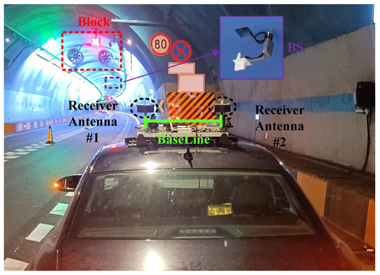 Configuration of the testing vehicle and surrounding environment. The user terminal was mounted on the top of the testing vehicle and consisted of two receivers with a separate receiving antenna. In the tunnel, signal blockage and reflection may be caused by reflective objects such as tunnel walls, large fans, and signs installed on the top of the tunnel.