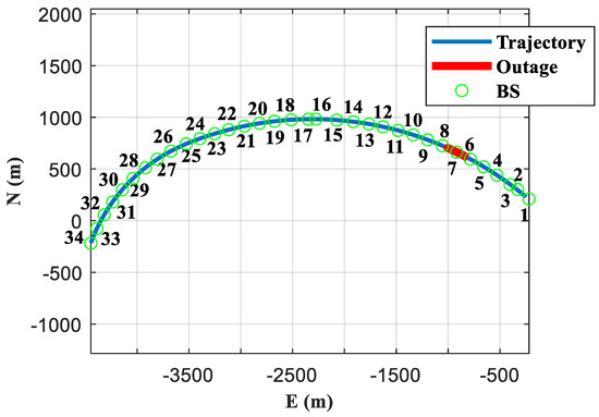 Due to the limitation of the physical visibility of line-of-sight signals by the curved tunnel, the receiver may receive non-line-of-sight signals, resulting in positioning errors. However, if the number of base stations used in the positioning is directly limited based on the distance between the base station and the user terminal, it may result in the number of available signals being lower than the minimum requirements for positioning, leading to an increase in positioning error. In addition, signal blockage and reflection may be caused by reflective objects such as tunnel walls, large fans, and signs installed on the top of the tunnel, as shown in Figure 20. As a result, the receiver can only ensure that the signals received from the two base stations in the front and rear directions of the vehicle are line-of-sight signals, resulting in a total of no more than four available signals. To simulate the signal outage condition, during the 55–65 s of the experiment (during which the vehicle traveled a distance of 213 m), three base stations, namely BS 5, BS 9, and BS 10, were shut down manually.