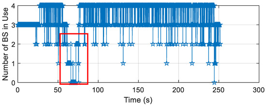 The number of available signals is shown in Figure 22. In most cases, the receiver uses 3–4 signals in positioning, and in a few cases, only two base stations can be used. However, it still meets the minimum number of signals required for positioning, although the positioning error may increase. Occasionally, there are fewer than two available signals at certain times, but due to the short time, there is no significant impact on positioning error. However, when the number of available signals decreased to one, and then further deteriorated to 0 over a while, it caused a significant impact on positioning accuracy.