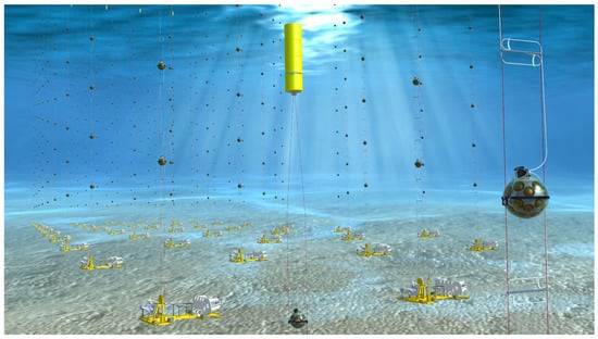 Artistic view of the KM3NeT detector. The illustration is not to scale: sunlight does not reach the depths at which the KM3NeT detector is deployed. The total instrumented volume of the KM3NeT detectors, once completed, will be around 1 km3 for ARCA and 7 × 106 m3 for ORCA.