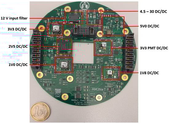In 2017, an upgrade of the PB was initiated with the aim of improving its overall efficiency. The PB was modified to operate more efficiently by replacing some of the DC/DC converters. These modifications reduce the power consumption, thermal losses [15], and temperature inside the DOM, thereby increasing the overall reliability of the DOM electronics. A set of new DC/DC converters was chosen, paying particular attention to their efficiency at the PB’s operating point and to their reliability. The original Murata DC/DC converters (https://www.murata.com/products/productdata/8807038189598/okl-t3-w12.pdf?1583754815000 (accessed on 15 January 2024)) of the 2.5 V, 3.3 V, and 5 V rails were changed. For 3.3 V, a similar DC/DC model from Murata with the proper current output was selected. For 2.5 V and 5 V, new models from Analog Devices were chosen. After implementing these modifications, a decrease of more than one Watt in the power consumption of the DOM acquisition electronics was achieved (see Table 1).