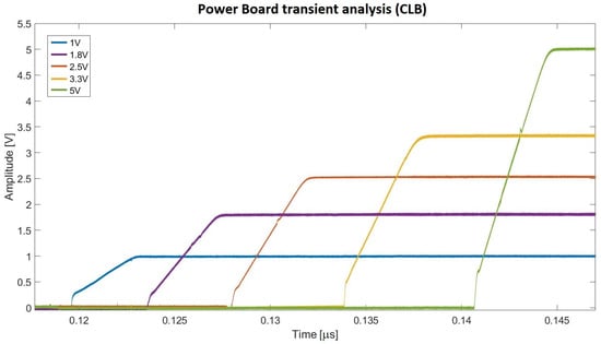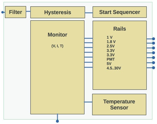 One of the functions of the PB is to provide a proper voltage startup sequence for the FPGA of the CLB (https://docs.xilinx.com/v/u/en-US/ds182_Kintex_7_Data_Sheet (accessed on 15 January 2024)). Providing a power startup sequence for FPGAs is crucial for ensuring reliability, functionality, performance, and seamless integration within other systems [12]. To achieve this, the PB includes a sequencer that generates the required sequence of voltages, which starts monotonically, as shown in Figure 9. The output of the hysteresis block initiates the sequence by starting the lower voltage rail (1 V). Then, the power-good signal of the lower voltage rail is connected in a cascading manner to prevent the higher voltage rails from starting until the previous rail has started successfully. In this way, a monotonically increasing sequence is produced. Two power-good signals are sent outside by the PB for monitoring and control purposes. The first one indicates that the voltage for PMTs has been successfully started (power-good PMT). The second one indicates the completion of the entire power-up sequence when the 5 V starts successfully.