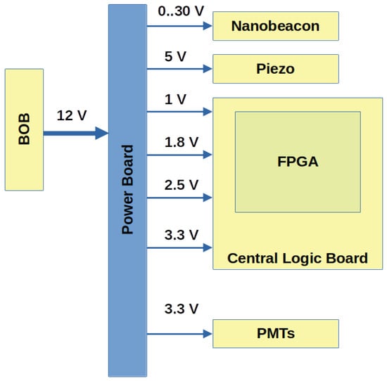The PB (Figure 3) is a crucial component of the KM3NeT detector, as it provides power to the CLB and to the rest of the DOM elements. Because of the remote location of KM3NeT in the deep sea, the PB design goals for the power board were low power consumption and high reliability. This is crucial because the maintenance of the deployed structures involves complex and costly operations. The architecture of the PB, including its various functionalities, is shown in Figure 4. The PB is supplied with 12 V, which is generated with a DC/DC converter from 400 V at the BreakOut Box (BOB), a waterproof enclosure at the input of the DOM that can withstand the harsh conditions of the deep sea. The breakout box is connected, via the DU backbone, to the DU base to receive the high voltage. The PB provides power supply (See Figure 5) to the piezo (5 V), to the Nanobeacon (the 0 to 30 V variable power rail), to the PMTs (3.3 V), and to the CLB (1 V, 1.8 V, 2.5 V, and 3.3 V).