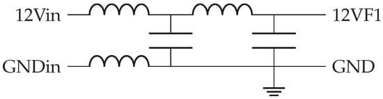 The PB incorporates an Electro-Magnetic Interference (EMI) filter to remove high-frequency noise from the 12 V DC input signal, providing a low-impedance path for the noise and allowing the desired signal to pass through with minimal attenuation. The filter consists of a Pi filter (see Figure 6) with two capacitors connected to the ground and an inductor connected between the two capacitors [10]. Two inductors connected between the power terminals and the inputs of the Pi filter are also included. The insertion losses of the filter have a minimum of 35 dB from 1 MHz to 1 GHz with a maximum drop of 30 mV. The filter can withstand a maximum voltage of 125 V (DC) and has a rated voltage of 50 V (DC) with a nominal operation of 12 V. The bode diagram of the filter is shown in Figure 7. Overall, the use of the filter improves the performance and reliability of the PB by reducing the impact of EMI noise on its operation.