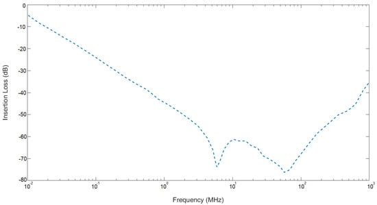 Bode diagram of the Pi filter at the PB to filter out high-frequency noise. From 1 MHz up to 1 GHz, the insertion losses are below −35 dB.