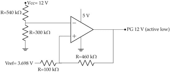 The PB implements a hysteresis loop to avoid instabilities at the startup [11]. The DC/DC converters of the PB are enabled only when the input voltage exceeds 11 V and are disabled when the input value drops below 9.5 V. In this way, the fluctuations in the PB regulators are avoided during power on/off. The scheme of the hysteresis subsystem is presented in Figure 8. To provide hysteresis functionality, an operational amplifier is used in comparator mode with positive feedback. The input voltage is compared to a reference voltage (3.698 V), and the output is either high or low, depending on whether the input is above or below the reference. The input voltage is supplied to the operational amplifier after a voltage divider circuit, enabling a range of operation from 0 to 5 V. The non-inverting input of the operational amplifier is connected to the operational amplifier output through a resistor. The inverting input of the operational amplifier is connected to the input reference voltage. The resistor values in the voltage divider circuit at the input are chosen to set the reference voltage to the desired switching thresholds. When the input voltage is between 9.5 V and 11 V, the output will be either low (active) or high depending on the current state of the system. If the output is low, the reference voltage will be 9.5 V, and the system will switch off when the input voltage drops below 9.5 V. If the output is high (inactive), the reference voltage will be 11 V, and the system will switch on when the input voltage rises above 11 V. This creates the desired hysteresis effect, where the switching threshold depends on the current state of the system, avoiding fluctuations in the switching up and down of the system.