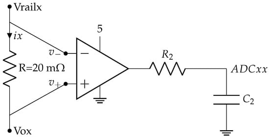 The currents and voltages of the PB are monitored in real time using two 12 bit ADCs of 12 inputs mounted on the board. In order to read out the current, resistance of low value, 20 mΩ, is mounted in series in the rail where the current is measured. The two pads of the resistor are connected to a high-precision current-sense amplifier, also called a current-shunt monitor, with a fixed gain of 50. As an example, a 0.5 A DC current causes a voltage drop of 10 mV at the 20 mΩ shunt resistor, which is amplified to 0.5 V by the operational amplifier. This voltage is digitized by an ADC channel, which is read out via I2C. Figure 10 shows the design of the circuit used to read out the rail intensity. Some rails, such as the 1.8 V, 2.5 V, and the regulated 5 V, use a shunt resistor of 50 mΩ because the current circulating is lower than in the other rails. The conversion ratio (voltage to current) for each rail is taken into account by the monitoring software. The PB also includes a temperature LM45BIM3 sensor (https://www.ti.com/lit/gpn/lm45 (accessed on 15 January 2024)), which is read out by one of the ADC channels. The voltages are adapted to the ADC voltage scale and connected to a voltage follower for readout. Voltages, currents, and temperature are read using two MAX1239 ADCs (https://www.analog.com/media/en/technical-documentation/data-sheets/MAX1236-MAX1239M.pdf (accessed on 15 January 2024)). In Table 2, the different ratios are shown.
