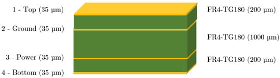 Stackup of the PB PCB. It contains four layers, all of them being copper and with a width of 35 m. The dielectric material is FR4, with a core of 1000 m and two external frames of 200 m. For a better representation, the image is not to scale.