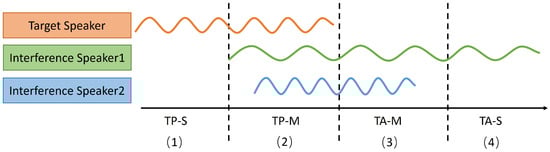 Therefore, to facilitate our work, as shown in Figure 1, we introduce a classification method that classifies real-world multi-talker speech into four types of scenarios, according to whether the target speaker is present or absent (TP or TA), and whether the speech overlaps (S or M). In this way, the speech mixtures composed of four random scenarios are closer to real-world communications. According to the classification, most prior TSE studies [6,7,8,9,10,11,12,13,14,15] have only focused on the TP-M scenario, where speech is highly overlapped and the target speaker keeps speaking. However, when applied to TA-M and TA-S scenarios, these studies may falsely extract a random speaker’s voice rather than the desired silence. This results in a strong negative effect on overall performance, which is called the false-extraction problem [17,18].