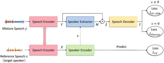- Delcroix, M.; Zmolikova, K.; Ochiai, T.; Kinoshita, K.; Araki, S.; Nakatani, T. Compact Network for Speakerbeam Target Speaker Extraction. In Proceedings of the ICASSP 2019-2019 IEEE International Conference on Acoustics, Speech and Signal Processing (ICASSP), Brighton, UK, 12–17 May 2019; pp. 6965–6969. [Google Scholar] [CrossRef]