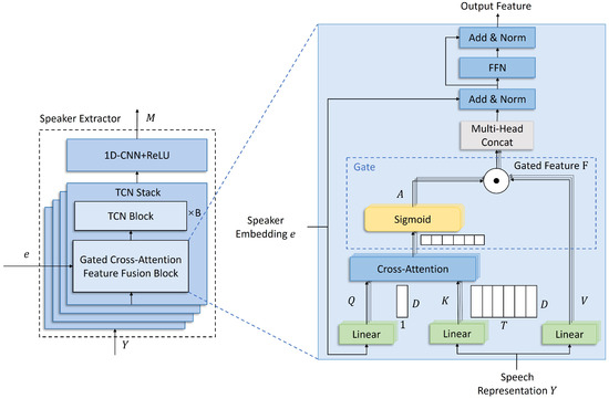 Figure 3 (right) shows the details of our gated cross-attention feature fusion block. It takes the target-speaker embedding and the mixed speech representation as inputs, and modulates the speech features according to the target speaker’s presence. A detailed description of the two mechanisms is provided in Section 4.1 and Section 4.2.