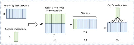 As shown in Figure 4(1), traditional feature fusion methods usually fuse the speaker embedding, e, and the mixed speech representation, Y, by concatenating, which makes it difficult to learn the degree of correlation between the two features. Some researchers [26] also use cross-attention in TSE. But as Figure 4(2) illustrates, they only apply attention to a sequentially connected sequence to learn the temporal correlation. However, as Figure 4(3) shows, our cross-attention is used to learn the interaction between e and Y in each time frame.