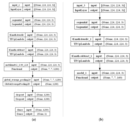 MobileNetV2 network architecture. The full network adapted for training is presented in (a), with the preprocessing and data augmentation layers at the beginning, then the internal MobileNetV2 model, and finally, the pooling, dropout, and dense layers added. The architecture of the feature extractor is presented in (b). It was created by cutting off the last 12 layers of the model on the left (also counting the hidden sub-layers of mobilenetv2_1.00_244, of which there are 154—therefore, they are not shown in the diagram). In this way, a model with the output (7, 7, 160) was obtained. Layer model_1 has 146 hidden layers copied from the MobileNetV2 model.