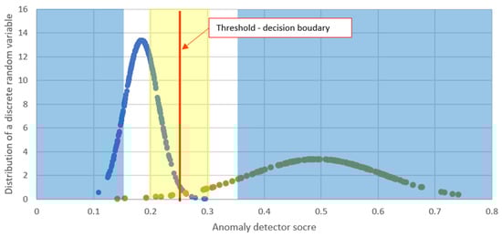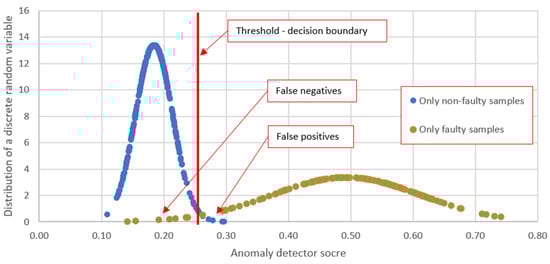 Normal distribution of anomaly detector scores. The graph shows the results for two sets: blue shows the results for the set containing only non-defective samples, and green shows the results for the set containing only defective samples. The decision limit is marked for a score of 0.25. Blue results above the threshold are False Positives, and green results below the threshold are False Negatives. The goal of active learning is to separate the results from these two sets. The main purpose of presenting the results using a Gaussian curve was the ease of graphical presentation of the data where the classes are binary.