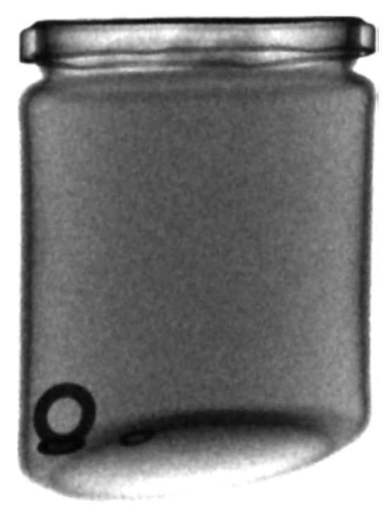 The problem of detecting glass fragments in glass packaging is challenging, especially in jars, because all physical properties of foreign objects are identical to those of the packaging itself. Whereas inclusions made of metal, wood, or stone are easily visible in X-ray images, glass shards are much less distinct. This issue has been recognized for a long time [29], with earlier publications indicating its difficulty [2]. In a study [30], ultrasound was used to detect glass shards, but this study pertains to the medical field rather than the industry. Some efforts to detect glass in food using thermographic methods have been described in [7]. Research on detecting defects in glass packaging has been undertaken in [31,32,33], but these studies do not specifically address foreign glass bodies. One work [34] describes an ultrasonic method for detecting glass in beer bottles, but this method may not apply to jars of pickled vegetables due to the heterogeneous contents. The detection of glass using Compton scattering of X-rays has been described in [35], and promising results have been achieved for glass submerged in water. However, this approach does not consider the issue of X-ray penetration through the packaging. Attention has been drawn to the problem of detecting transparent glass in transparent bottles in the wine industry [36]. Commercial implementation of a system for detecting glass in glass packaging can be found in [6,37], but only the former directly addresses the solution for detecting glass within glass.