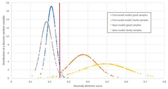 A threshold for the anomaly score is determined for each product batch, typically set at 0.25. This threshold serves as the decision boundary: all samples with an anomaly score greater than the threshold are classified as defective. For the examples described in [62], such a threshold selection achieves effectiveness ranging from 92.5% to 100%, as determined by the F1-score metric, depending on the test set (e.g., defects in blister pack tablets, defects in bottle caps).
