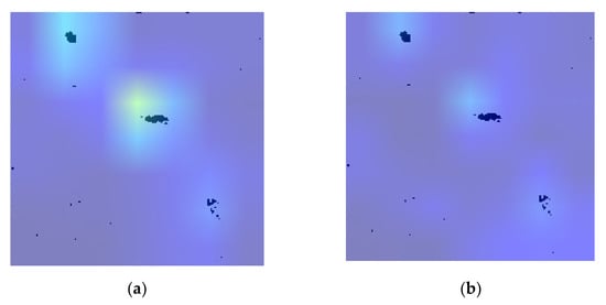 To better illustrate the anomaly detector’s performance, we implemented a heatmap, where deviations from the norm are highlighted in brighter colors (Figure 12). Brighter areas around visible inclusions indicate deviations from the norm. The higher the anomaly detector’s score, the brighter the color of the anomaly. Both images depict the same sample. The left image shows the result of the default MobileNetV2 feature extractor, and the right image shows fine-tuned feature extractor. The brightening in the right image indicates that the base model is more confident in finding the inclusion. This is reflected in the anomaly detector’s score. The left image scored 0.32, whereas the right one obtained 0.51. Therefore, during active learning, the model’s confidence in detecting defects decreased, which can be associated with the convergence of the average anomaly detector score to the threshold of 0.25.
