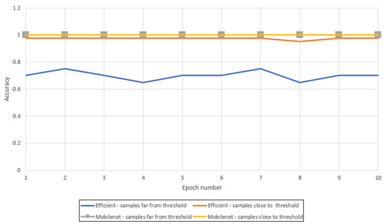 Regarding the best approach to active learning, the scenario of selecting samples distant from the threshold and close to the threshold was analyzed. To illustrate the learning process, the accuracy for 10 consecutive fine-tuning epochs for MobileNetV2 and EfficientNetV2 models for the first iteration of active learning was presented on the X-axis plot, divided into the method of selecting samples close and far from the threshold. Models with the same hyperparameters as those presented in Table 6 were used.