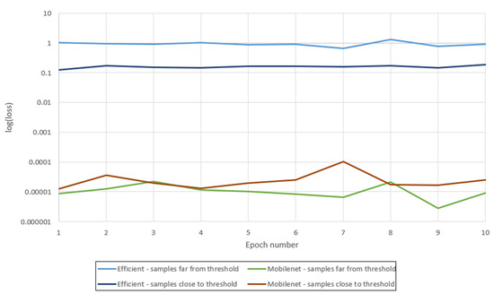 Loss chart for four models. The vertical axis is presented on a logarithmic scale. The loss rate for the MobileNetV2 model is several orders of magnitude lower. There is no significant difference whether samples are taken close to or far from the threshold.