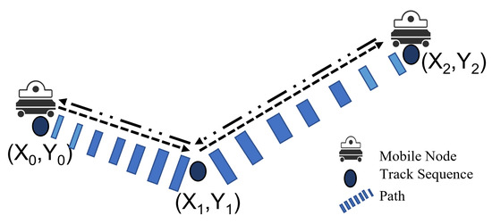 We form clusters of mobile IoT LoRa devices in different SF regions with a finite number of cluster heads (CH > 1). The collection of all CHs is CH = {CH1, CH2, …CHn}, where n is the partition or cluster number, and each CH has a coordinate . We assume that sensor environment A contains mobile nodes with LD > 0, denoted by , and that mobile nodes move along a predetermined path via vision. The topology of the network can be altered, and the LoRa nodes can move with a minimum speed of 0.5 m/s and a maximum speed of 5 m/s. Let and velocity represent the sets of paths and velocities, respectively. According to [1], mobility in LoRaWAN can only be achieved in the uplink. When an end node moves, its location changes, and at the same time, it can send data. This can be achieved using any of the three classes without latency as long as it is within the coverage of LoRaWAN network GWs. Figure 2 illustrates the trajectory of an IoT LoRa mobile device LD(i), following the random waypoint (RWP) model over time t, emphasizing the mobility pattern of the node. Here, we obtain the mobile node’s moving distance during a given period, and the coordinates of LD(i) change from to . The communication trajectory sequence () of LoRa mobile device LD(i) along a path () contains a series of moving positions over a given period t, .
