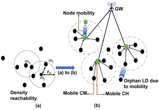 The cluster formation scheme is based on adaptive DBSCAN used in [46], a density-based clustering technique that is ideal for grouping nodes based on their geographical distribution with varying densities and shapes. This can be beneficial for locating regions with a high concentration of mobile nodes and following their movement patterns over time. Figure 3 illustrates the AMILCC scheme for mobile IoT LoRa devices, combining cluster formation and communication into a cohesive framework. Figure 3a depicts how mobile LoRa devices (LDs) form density-based clusters within a defined radius , achieving a minimum neighborhood device count () through k-nearest neighbors analysis. Figure 3b illustrates the internal cluster connectivity, showing how cluster members connect with CHs, which, in turn, facilitate communication with the gateway (GW). This streamlined depiction not only simplifies the understanding of the clustering mechanism but also highlights the pivotal role of CHs in ensuring effective data transmission and network efficiency. Given that k is equivalent to , a value of 4 was selected for k. Consequently, the distance to the four nearest neighbors from any given LoRa device is calculated as the Euclidean distance between LD(i) and its four nearest neighbors. To determine the radius , the Euclidean distance between any k mobile neighbors is computed using Equation (10), where is a core LD and is any other LD in the neighborhood. The parameter k is determined using Equation (11), and radius is given by Equation (12), where , and contains ’s k nearest neighbors.
