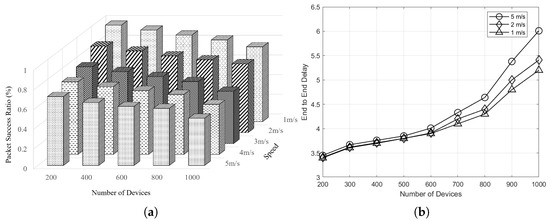Plots of the impact of speed and the number of devices. Analyzing the packet success ratio and end-to-end delay in the proposed AMILCC scheme: (a) Packet success ratio as a function of the number of devices and speed (m/s); (b) End-to-end delay as a function of the number of devices with varying speeds.