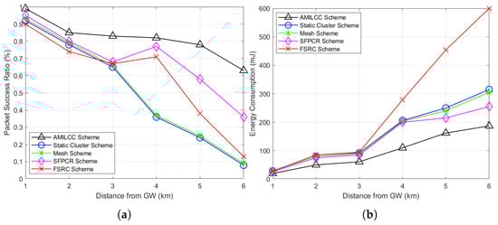 Plots of the performance evaluation metrics. The packet success ratio and energy consumption plotted against the distance from the GW with a 30-byte payload for various schemes: (a) Packet success ratio as a function of the distance from the GW (km); (b) Energy consumption as a function of the distance from the GW (km).