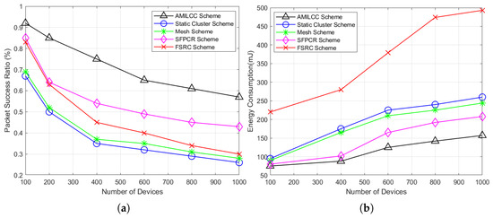 Plots of the performance evaluation metrics. The packet success ratio and energy consumption plotted against the number of devices of various schemes: (a) Packet success ratio as a function of the number of devices; (b) Energy consumption as a function of the number of devices.