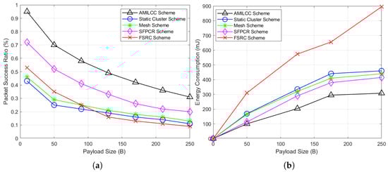 Plots of the performance evaluation metrics. The packet success ratio and energy consumption plotted against payloads of various schemes: (a) Packet success ratio as a function of the payload (B); (b) Energy consumption as a function of the payload (B).