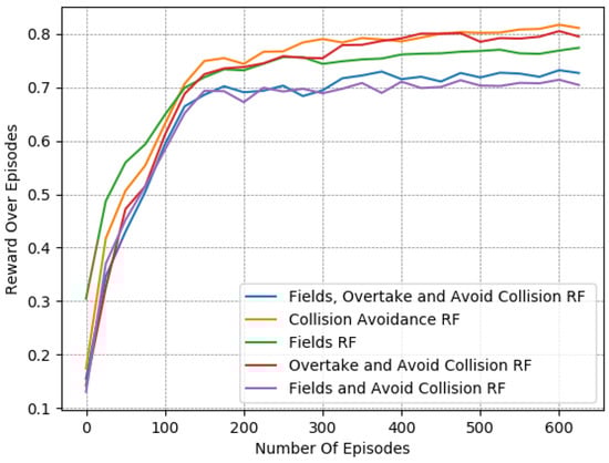 The training process evolves into an iterative procedure due to the fine-tuning of diverse instructional hyperparameters. Monitoring the progress of individual models facilitates the determination of suitable values for these parameters. While this statement universally applies to Machine Learning, Reinforcement Learning introduces an additional challenge, namely the definition of a reward function that quantifies the success of a specific objective, thus indirectly leading the agent’s behavior to the optimization goal. However, on the one hand, the achievable performance highly varies based on the selected rewarding criteria, as shown in Figure 2. On the other hand, articulating this function is inherently intricate; often, various physical attributes are interconnected heuristically, and the adaptability of trained agents to a specific environment becomes discernible through their behavioral manifestations.
