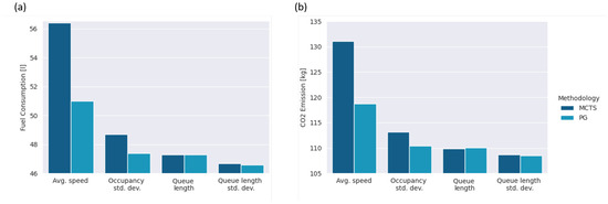 Sustainability metric results gathered on a single-traffic intersection scenario: (a) Fuel consumption and (b) CO2 emission.