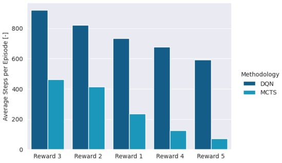 An analysis of the results, presented in Table 2 and in Figure 10, reveals that the generated order is identical in both scenarios. Specifically, both MCTS and DQN agents attained optimal results utilizing Reward #3, followed by a sequence of decreasing performance trends employing Reward #2, Reward #1, and Reward #4, and the worst performing agents have been trained on this task applying Reward #5. It confirms that extensive training can effectively address this issue through preliminary evaluation of the reward strategies. As a result, as the MCTS is able to transform the prior need of multiple trainings due to the diverse set of rewarding strategies concerning the initial RL problem to a planning task, thereafter only the most suitable reward function needs to be employed in the sole Reinforcement Learning training run, which is contrary to the traditional approach. In practical implementations, the application of this method allows the MCTS to minimize the required training sessions from n to 1, where n represents the number of eligible reward functions considered in the experiment, thereby optimizing the process to obtain the best neural network model with Reinforcement Learning efficiently.