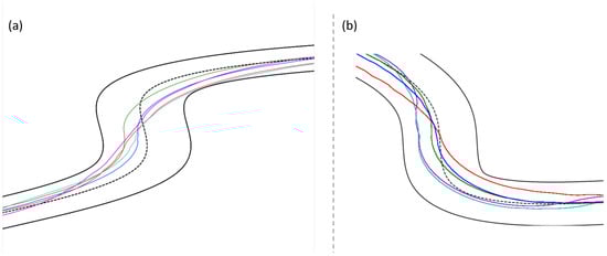Once the vehicle model is established, the subsequent critical consideration involves track generation, where ensuring adequacy stands as a fundamental concern for successful training. By employing suitably randomized tracks, as shown in Figure 5, the issue of overfitting can be mitigated, thus facilitating the design of universally applicable trajectories. These trajectories are not solely tailored to enable the vehicle to navigate specific segments but also aim to ensure broader applicability. The generation of these tracks occurs along different seeds and is represented in the simulator characterized by the vehicle’s center of mass. Additionally, the simulator specifies the maximum deviation; failure to maintain lane keeping within this limit results in track failure for that specific step.