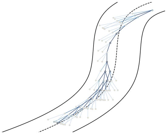 Moreover, the generated search tree of the MCTS-based agent is shown in Figure 12 along a curvature track segment. Here, the optimal trajectory arc, converging to the lane centerline, is evident through the expansion of future states in the planning space. The intensity of transition colors over nodes corresponds to the visit count , with darker shades indicating more frequent visits. Thus, it becomes apparent how the initial position, orientation of the vehicle, and environmental constraints collectively shape the optimal trajectory, which are guided by a specific reward function, as evidenced by the darkest state transition sequence.