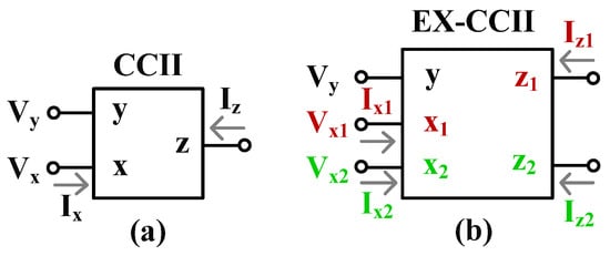 - Agrawal, D.; Maheshwari, S. Current mode filters with reduced complexity using a single EX-CCCII. Int. J. Electron. Commun. 2017, 80, 86–93. [Google Scholar] [CrossRef]