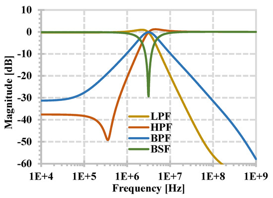 - Agrawal, D.; Maheshwari, S. High-performance electronically tunable analog filter using a single EX-CCCII. Circuits Syst. Signal Process. 2021, 40, 1127–1151. [Google Scholar] [CrossRef]