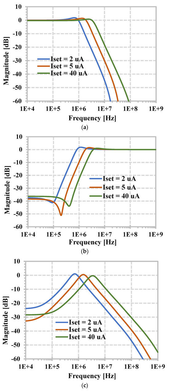Simulated magnitude frequency responses with Iset = 2, 5, 40 µA, (a) LPF, (b) HPF, (c) BPF, (d) BSF, and (e) APF.