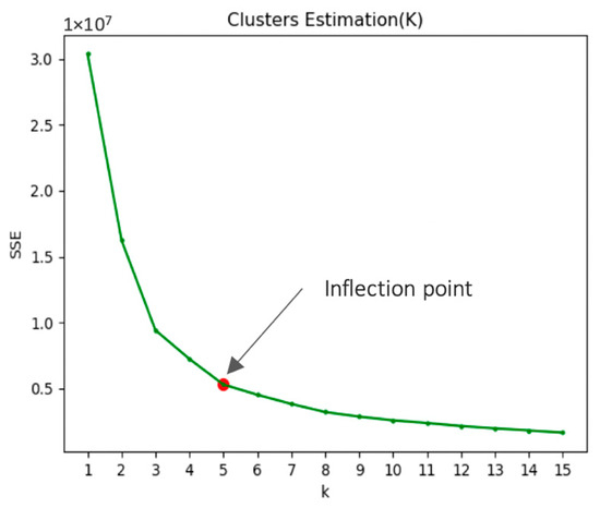 Step 4: According to the SSE values after multiple rounds of clustering, a graph of the SSE change rate with the k-value is generated and the ‘inflection point’ is calculated, as shown in Figure 3, that is, a point where the SSE change rate is less than the threshold , as the following formula: