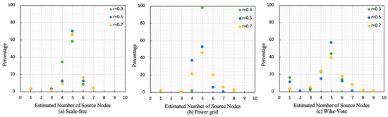 Estimation result of source nodes in three networks: (a) the experimental results of estimating the number of source nodes on the data sets generated by the scale-free data set; (b) the experimental results of estimating the number of source nodes on the data sets generated by power grid; (c) the experimental results of estimating the number of source nodes on the data sets generated by Wiki-Vote networks.