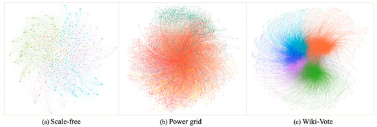 This paper chooses three data sets of different scales for experiments, namely the scale-free network data set, the power grid data set, and the Wiki-Vote data set. The scale-free network is a random network with uneven distribution. In this kind of network, there are a few nodes with a large number of edge connections, while most nodes have only a few edge connections. For example, a few users in social networks have a large number of fans, so it is a data set close to the distribution of real social networks. The power grid data set and the Wiki-Vote data set are real-world social network data sets. The power grid data set is an undirected and unweighted network; it is a topological data set of power grid distribution in the western states of the United States, which comes from the website (http://www-personal.umich.edu/~mejn/netdata/, accessed on 9 January 2024), and the Wiki-Vote data set comes from the website of Stanford University SNAP Library (http://snap.stanford.edu/, accessed on 9 January 2024). It is a directed unweighted graph itself, but in the experiment, this paper transforms it into an undirected graph, removing repeated edges for reuse. This paper accessed the data sets on 6 October 2023. The specific data information for these three networks is given in Table 2.