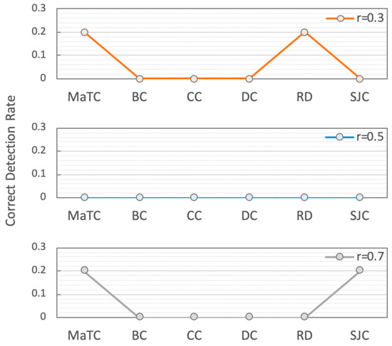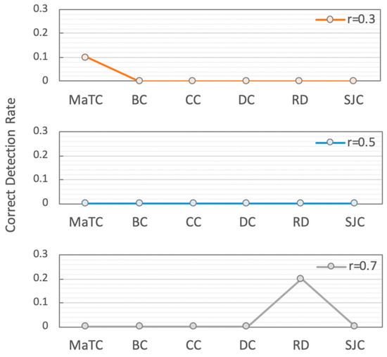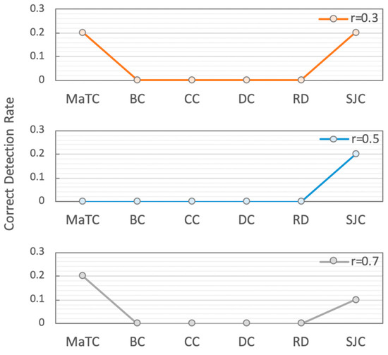 Figure 8 shows that when r = 0.3 and r = 0.7, the identification performance of the MaTC algorithm is relatively stable, and the correct detection rate reaches 20%. At the same time, the correct detection rate of the SJC algorithm is also better, but when r = 0.5, the correct detection rate of the MaTC algorithm and other algorithms is 0, and the correct detection rate of the SJC algorithm reaches 20%.