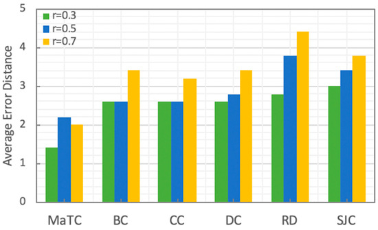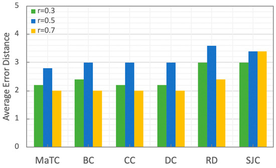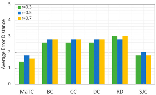 Figure 9 shows that the average error distances of the BC, CC, and DC algorithms are almost the same under different spread infection rates. When r = 0.3, the error distances of these three algorithms are lower than those of r = 0.5 and r = 0.7. The MaTC algorithm presented in this paper performs better and the basic error distances are kept within 2, followed by the SJC algorithm.